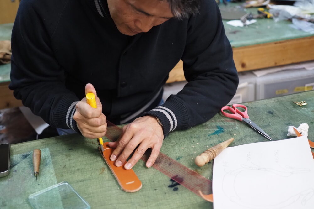 といってもただ闇雲に線を引くのではなく、このときにレザーの表面にあるキズなど見分け、大きなキズは避けるようにするだけでなく、レザーに無駄が出ないようにパーツとして裁断する場所を決めることが大事。