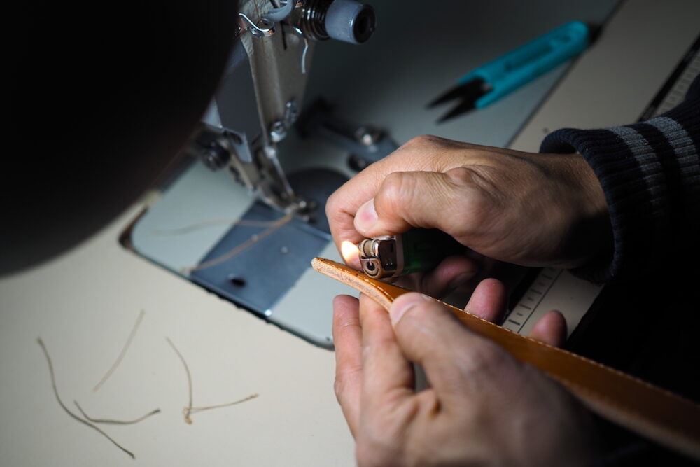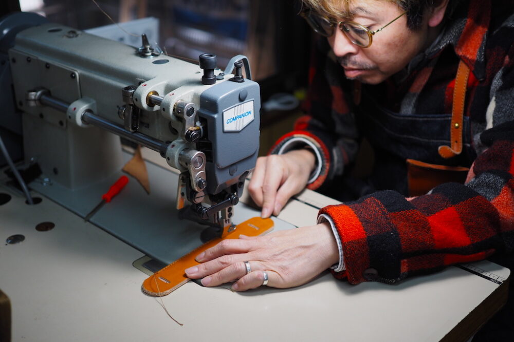 2つのレザーパーツが接着され、フォルムを整えたら仕上げに周囲を縫製する。ここで分厚いレザーもガンガン縫製してくれる工業用ミシンの出番である。といってもミシンにはガイドが付いているので、ガイドで縫製したい位置を出せば大きな失敗をすることはないので、いざ縫製!