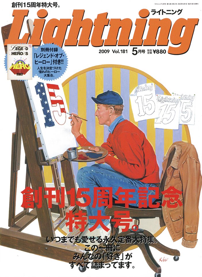 15周年記念特大号、ライトニング2009年5月号(Vol.181)発売。特別付録小冊子は『レジェンド・オブ・ヒ ーロー』。 ジェームス・ディーンから衣笠祥雄、ケンシロウまで、チョイスに節操はないが、パンチのあるヒーローがずらりと並んだ。