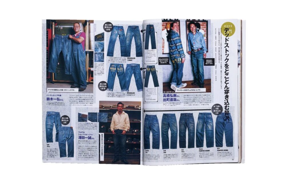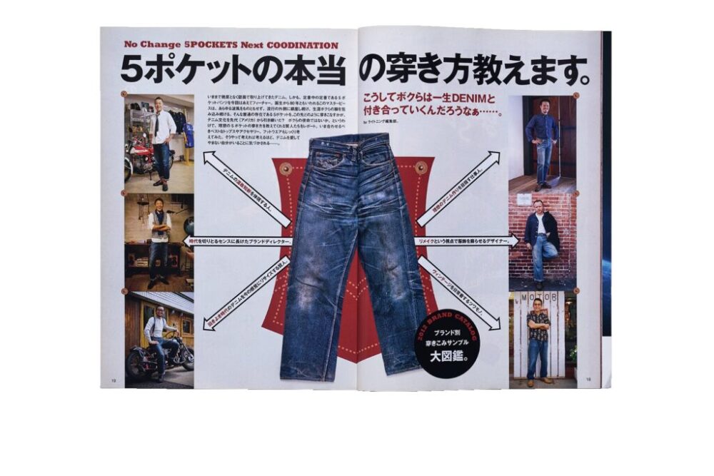 表紙には当時あったLightningファームで自分でペンキを付けたランボルギーニ三浦のジーンズを着用姿で採用。巻頭特集は様々なブランドの方が新品から穿き込んだ色落ち自慢のジーンズを山ほど紹介している。