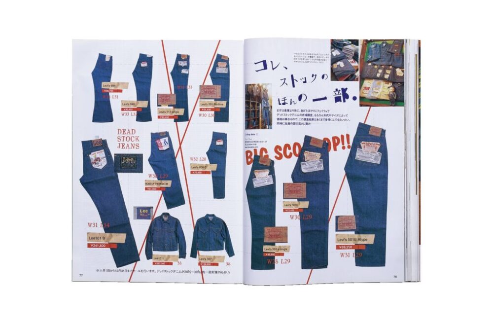 デニム特集号ではないけれど、原宿の老舗ヴィンテージショップ『フェイクアルファ』の紹介ページがあり、そこに掲載されたデッドストックのヴィンテージ・リーバイスをリスト化した文字だけのページが面白すぎるので紹介しとこう!