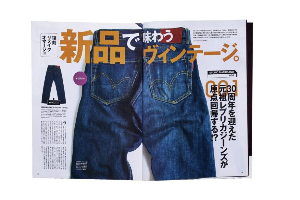 「ヴィンテージの復刻プロダクツ」をテーマにした巻頭特集。最初にドカーンと紹介したのは、元祖レプリカジーンズといえるステュディオ・ダ・ルチザンのもの。30周年を迎えてブランド黎明期の1986年のモデルを復刻するという記事。
