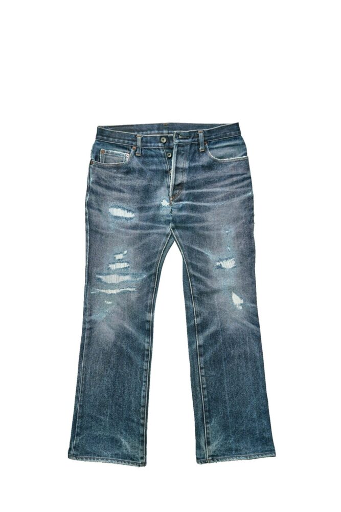 約10年間、仕事中もバイクライドでも履き続け、股や腿、膝まわり、裾などにリペアを繰り返した跡がアイデンティティとなるブーツカット。愛車と様々な道を共にしたに違いない。