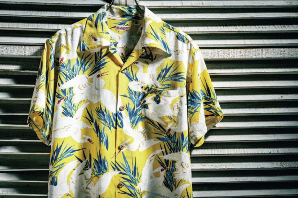 中/もちろんです。このアロハシャツも旧く、1950年代後期の作品となっています。モチーフとして白鷺が使われるのは珍しく、そのモチーフを強調するような描かれ方を手に取って見ていただけたら嬉しいですね!