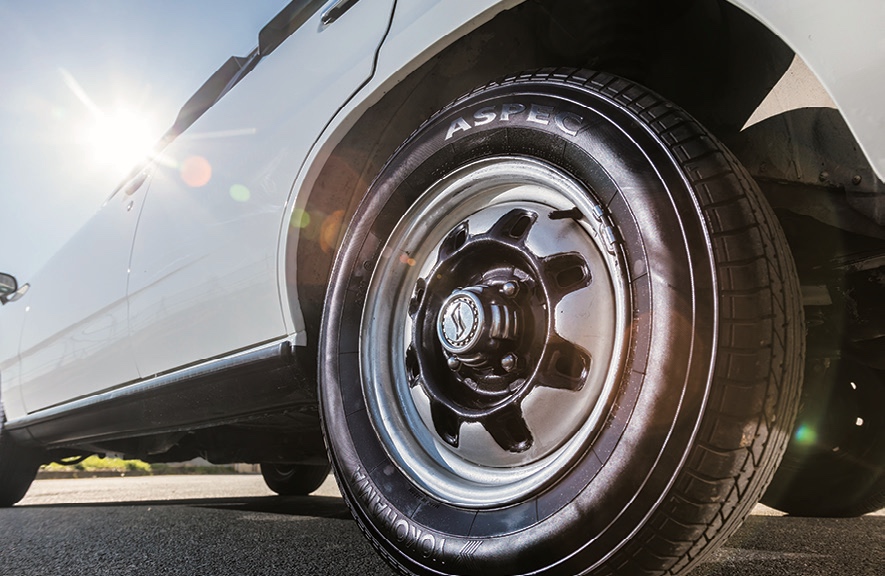 ホイールはセンターキャップ周囲がブラックとなるスティール製の飾りホイール。センターキャップはSマーク。