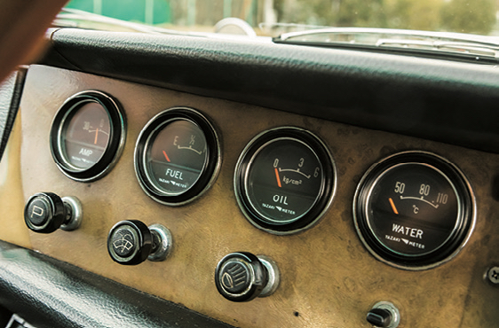 水温、油圧、燃料、電流の各ゲージが並ぶ。