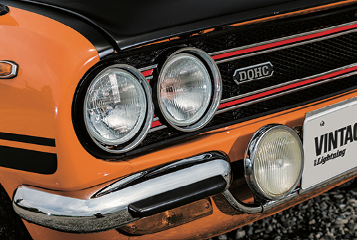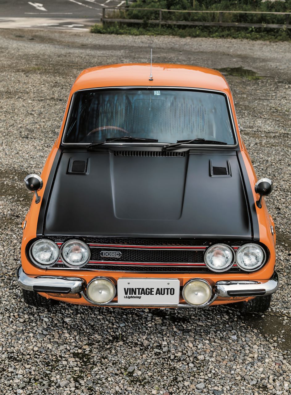 取材車両はイスズスポーツが所有する’70年式。オプションのブラックのエンジンフードやストライプも備わる個体。ホイールはワタナベに交換されているが、初期のベレットGTRのディテールを残している一台だ。