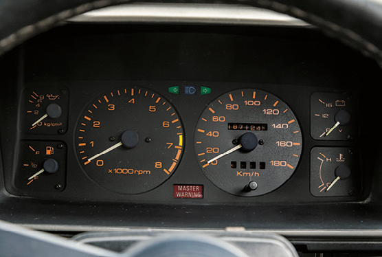 ステアリングは小振りなナルディのクラシックに交換されているが、比較的オリジナルをキープしたダッシュ周り。