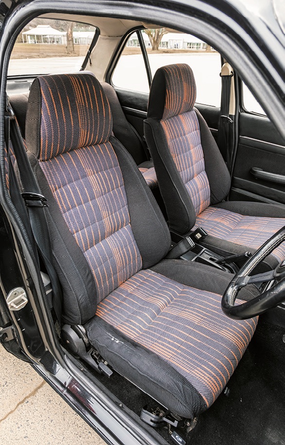 シートはホールド性のよいヘッドレスト一体のセミバケットタイプ。赤いラインの入るファブリックは最終モデル専用のパターン。