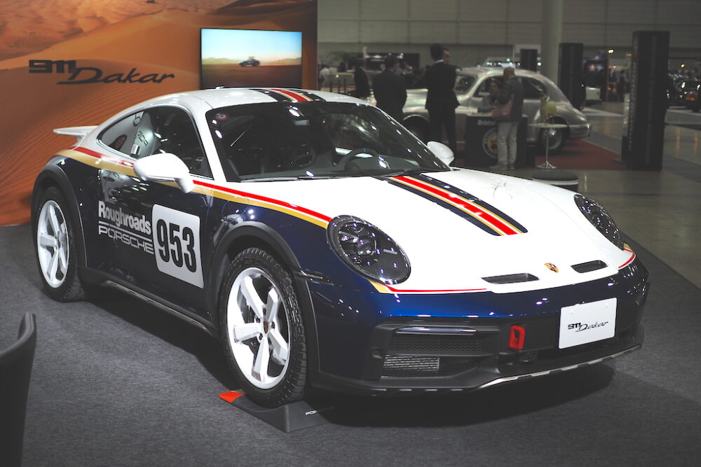ポルシェジャパンのブースで展示されたポルシェ911ダカールは、911カレラをベースに車高を50mm上げ、専用のボディカラーになったスペシャルなモデル。オフロード走行を得意とする911のなかでも特別なモデル。