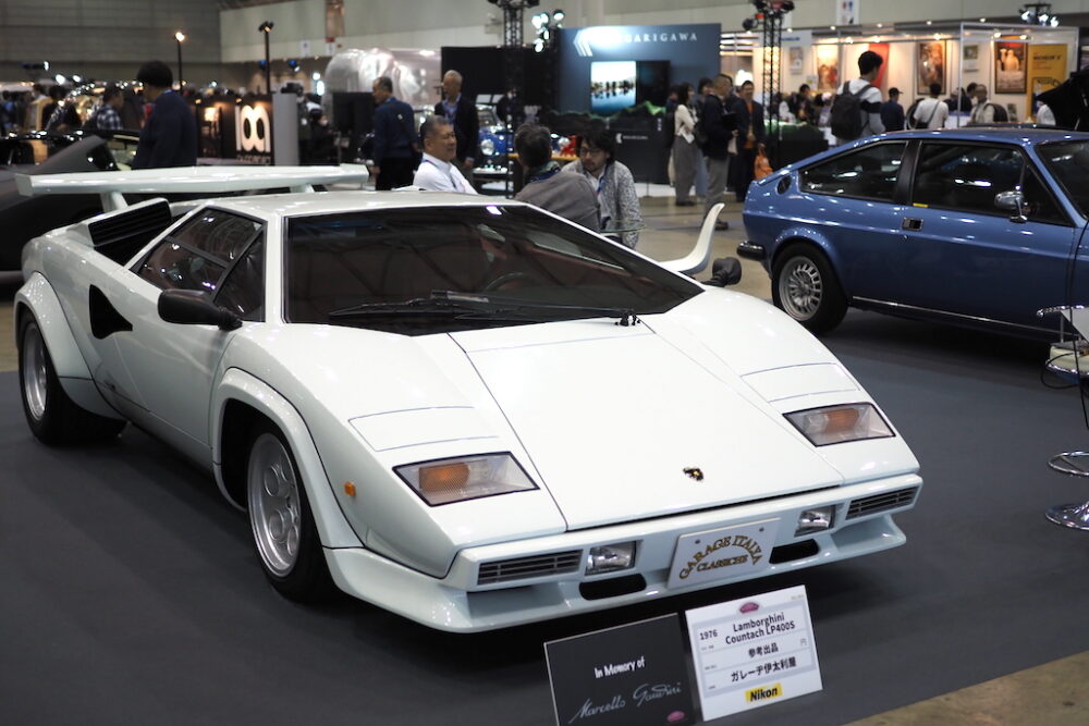 低く身構えたボディに張り出したフェンダーアーチ、それにガルウィングと呼ばれる跳ね上げ式のドアなど、スーパーカーの王様として君臨するランボルギーニ・カウンタック。特別出展のため価格は無し。デザイナーであるガンディーニを追悼するための企画展の出展車両。