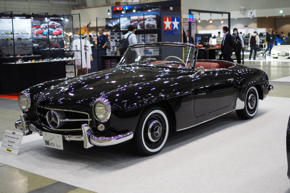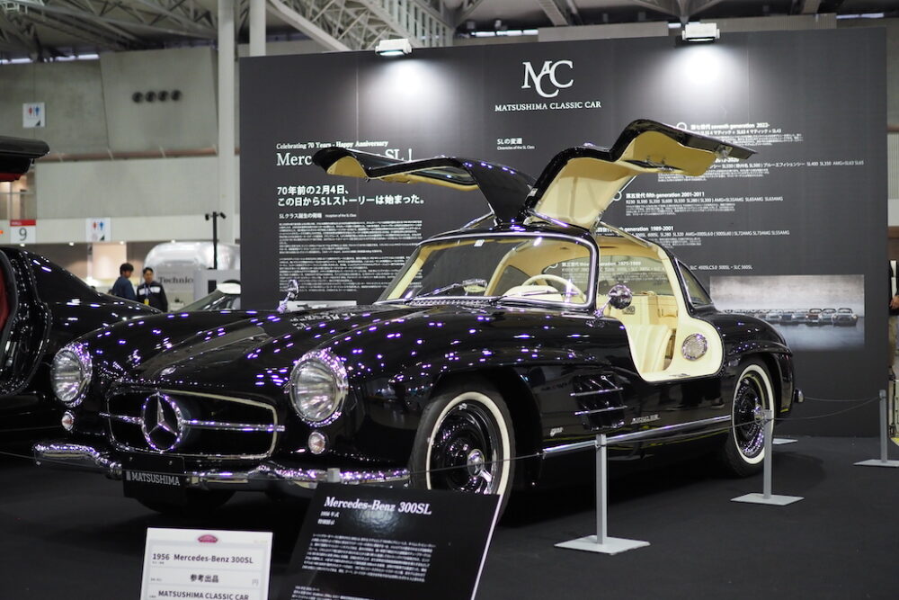 当時は市販車で最速だっただけでなく、ガルウィング式のドアが独創的だったメルセデス300SLはミュージアムピースともいえる泣く子も黙るクラシックカーのトップモデル。レーシングカーをベースに制作されたというストーリーだけでも男心をくすぐる。残念ながら特別展示のため売り物ではなかった。