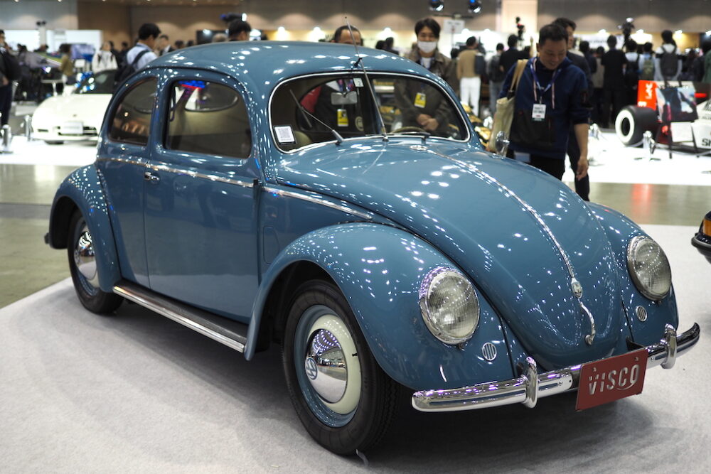 リアウィンドーが2枚になる通称スプリットウィンドーのビートルは今や稀少車の領域。こちらも特別展示でNFS(ノット・フォー・セール)だったけど、かなりの高額物件であることは間違いなし。この何とも言えないくすんだブルーのボディカラーがヴィンテージモデルらしさにひと役買っている。