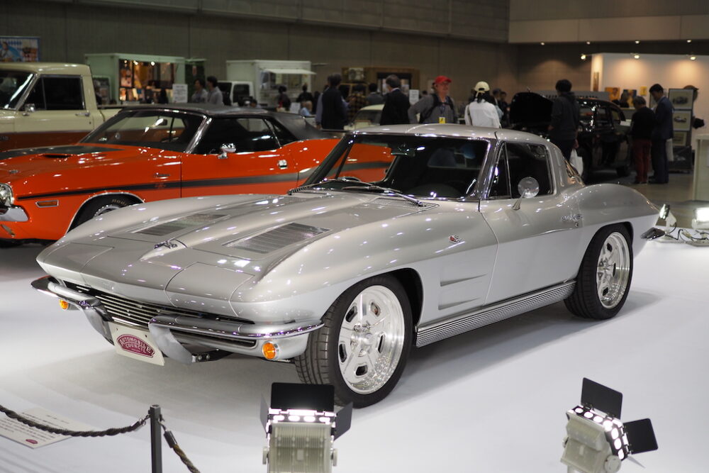 今回の企画展のひとつである「アメリカン・ヘリテージの名車たち」に登場した’63年式シボレー・コルベット。これは第2世代の最初のモデルで、リアウィンドーが2枚のガラスで構成されるスプリットウィンドーを持つ1年しか製造されなかった稀少モデル。アメリカ車も欧州車と変わらずその価値は高騰中である。