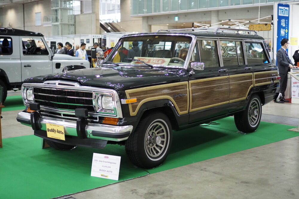 稀少色であるハンターグリーン(写真では表現しにくい色)のグランドワゴニアはフルレストアされた美車。アメリカでは当時の最高級ジープだったワゴニアも高騰物件のひとつで、フルレストアが10万ドルスタートというのも当たり前なところ、現車は国内でレストアされて1280万円というプライス。意外と良心的かもと思う人たちが数多く詳細を聞いていた。これは最終年式で製造は当時製造権をAMCから引き継いだクライスラー製。