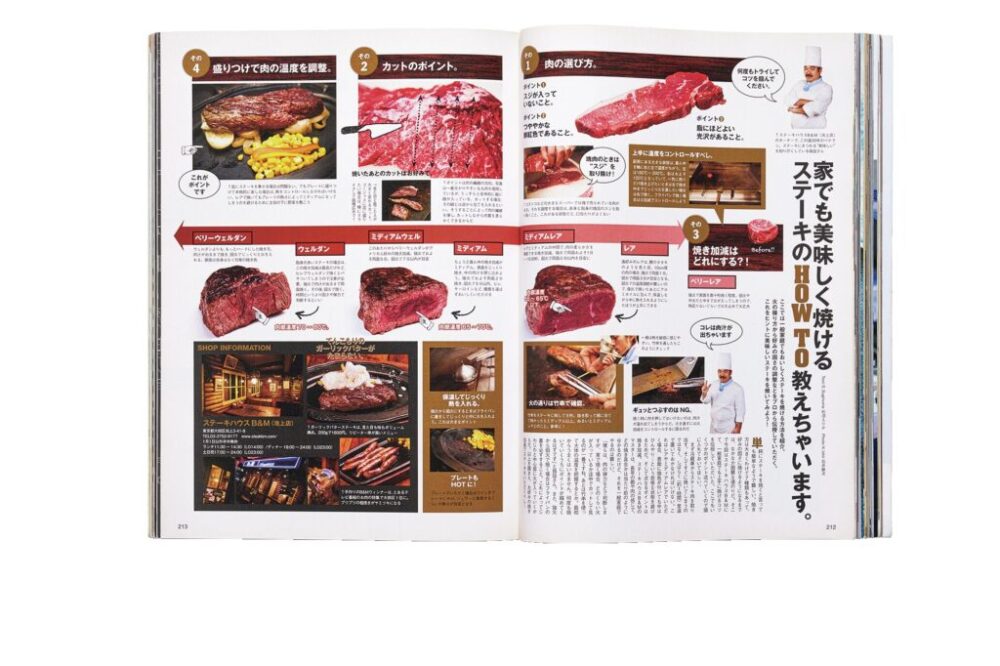 部位や焼き方、ソース、ナイフまでなど美味しいステーキを食べるための教科書的な特集。当時の行くべきステーキ店など、いろいろな情報が掲載されていて面白い!