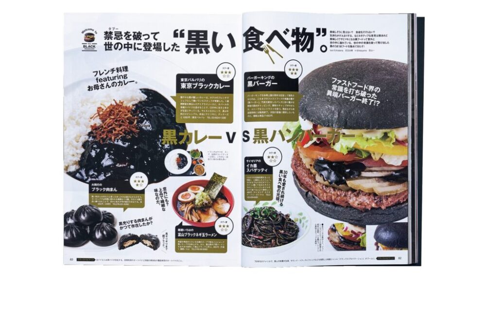 クルマや時計、スタジャンなど黒いものだけを集めた特集に、黒いフードもご紹介。黒いカレーやハンバーガー、ビール、和菓子など案外あるものだ。意外性はあるが、やっぱり黒い食べ物もかっこいいんだなぁ。