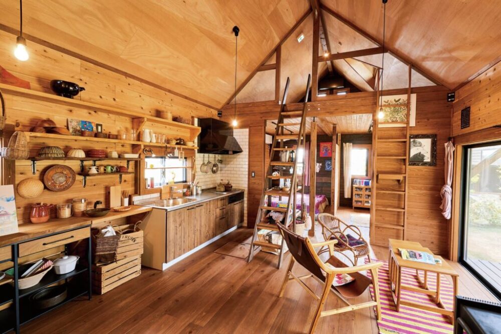BESSのモデルの中で唯一の平屋となる栖ログ。平屋と小屋、そしてログが出会い誕生した新発想のモデルだ。家中がひとつづきの空間となっており、家の中とは思えない開放感に溢れている。間仕切りを付けるのも移すのも、取り払うのも自由。ロフトを寝室や趣味部屋として使うのもいいかも。