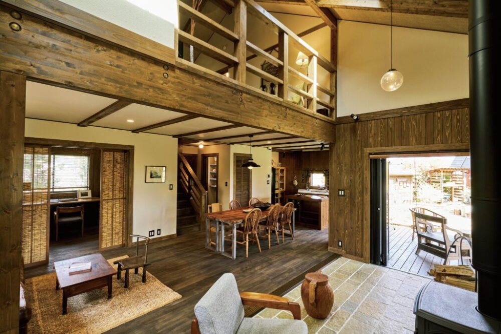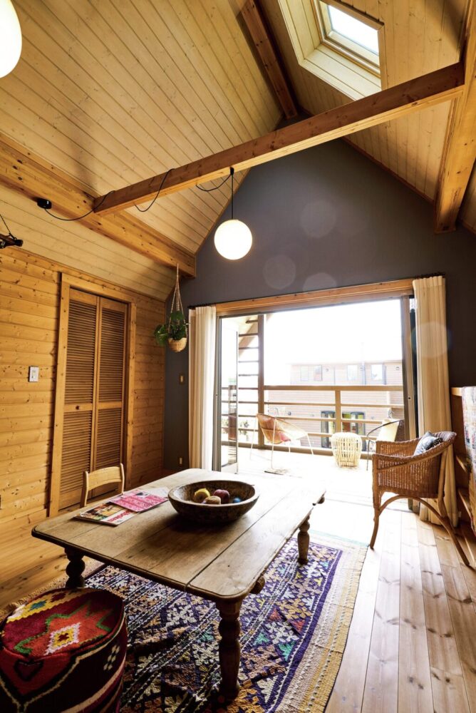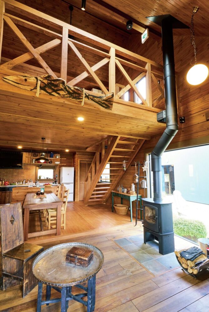 アメリカのカントリーサイドに建っていそうな外観が人気のカントリーログ。ドアを開けると、そこは「木の楽園」。周囲を木で囲まれた土間空間が広がり、ゆったりとした時間が流れている。この土間空間を自分ならどう使いこなすか、考えるだけでもワクワクする。
