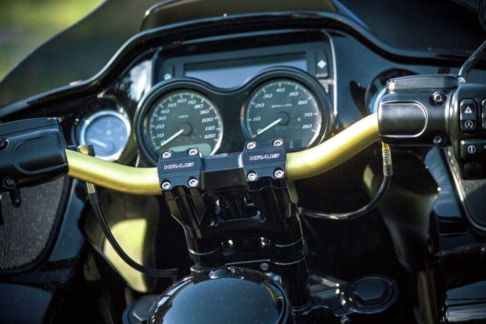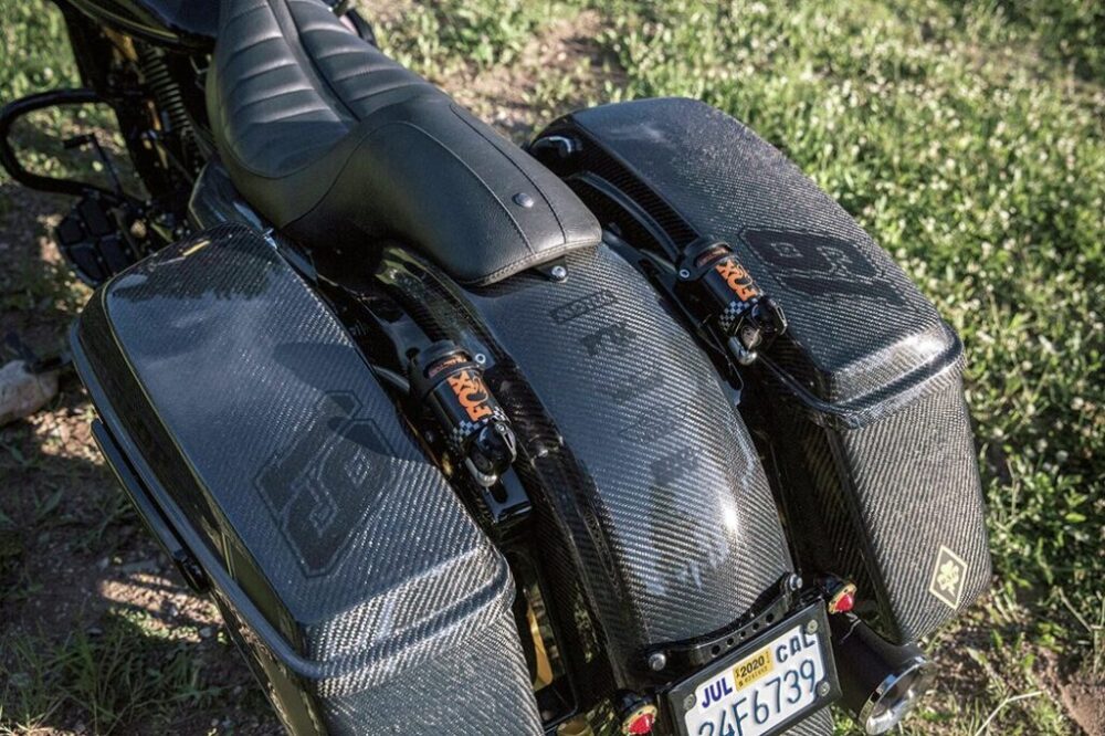シーンの最先端をいく「ローランドサンズ デザイン(RSD)」製作のロードグライド。低めのバーに高さのあるライザーを組み合わせた鉄板のハンドルまわりのほか、ラジアルマウントのキャリパーにゴールドのホイールを組み合わせてスポーティな印象に。加えてこのバイクを個性的に見せているのが随所に奢ったカーボンパーツだ。