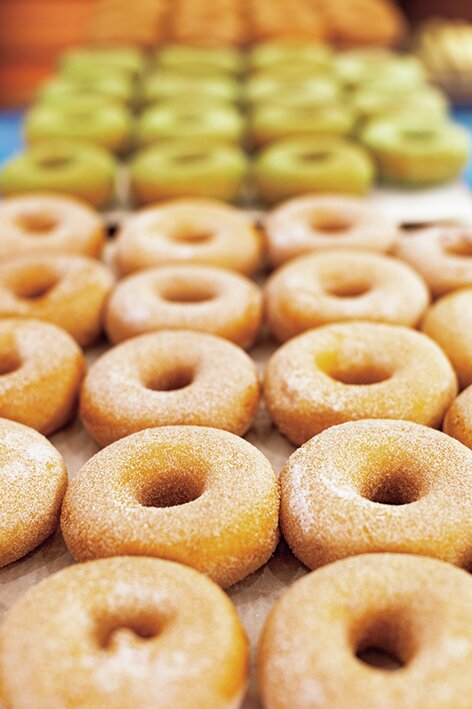 すべて手作りのドーナツは植物油を使用し、日本人の舌にも合う甘さを追求している。「出来立てのドーナツを食べて欲しい」というオーナーの想いから、作り置きではなくリアルタイムで作ったドーナツが次々と店頭に並べられる。日替わりでその数何十種類。クラシカルな大きめのドーナツにも関わらず、良心的な価格もハッピードーナツの魅力だ。