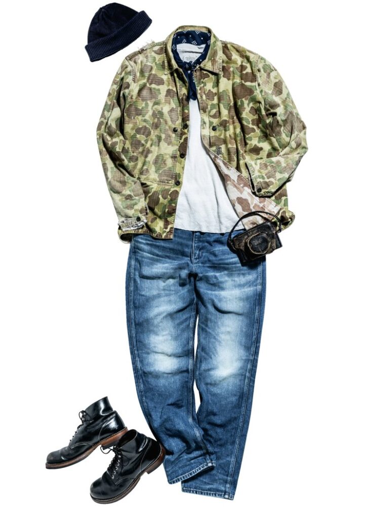 カメラマンにとってワードローブに求めるのは、ハードユースに耐えられるヘビーデューティな作り。カウボーイたちが愛したブロークンデニムは、彼の要望にぴったりだった。トップスはスリフトで見つけたダックハンターカモ。タフでポケットの多さが気に入っている。