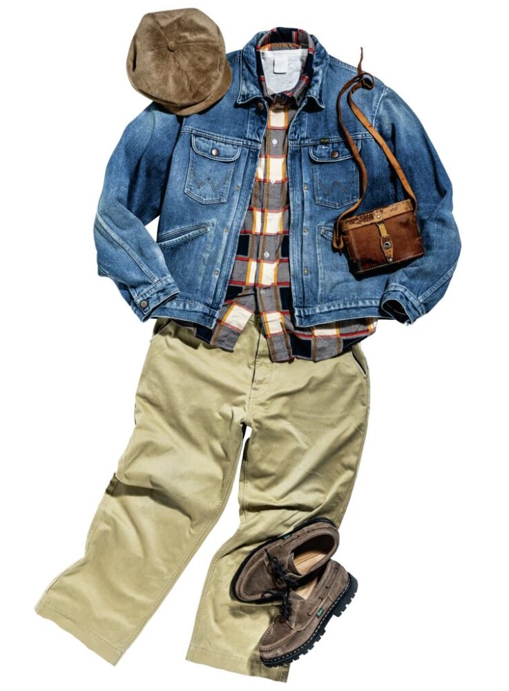 カウボーイにターゲットを絞ったラングラーは、袖が長く、タイトでも動きやすいアクションプリーツが付くシルエットなので、バイクに乗る際も快適だった。そんな美しいシルエットを活かすには、ミリタリーらしい太めのシルエットのチノパンがうってつけだったのだ。