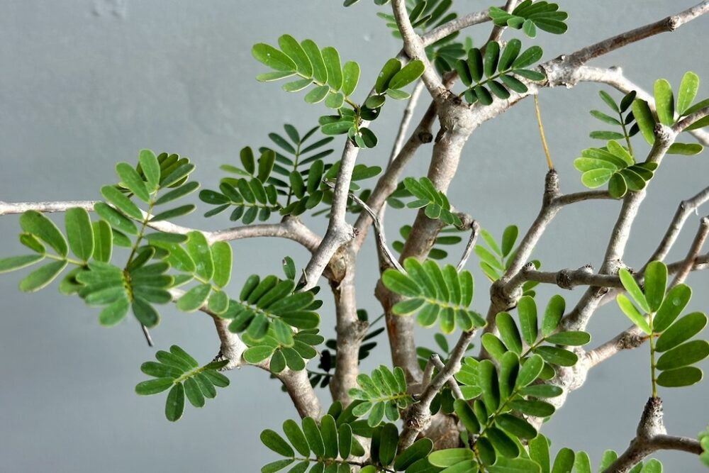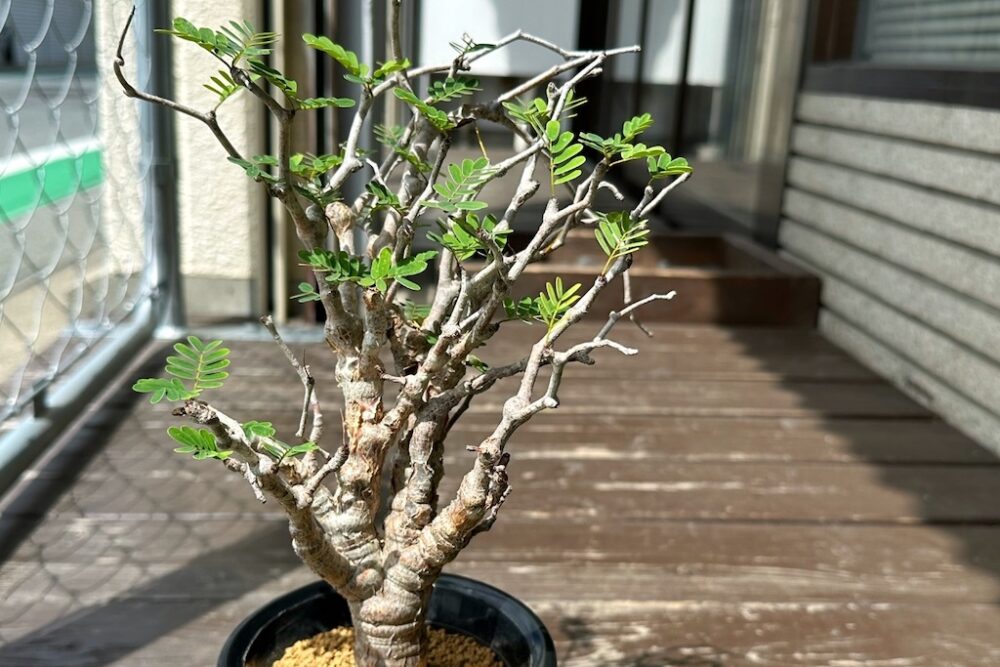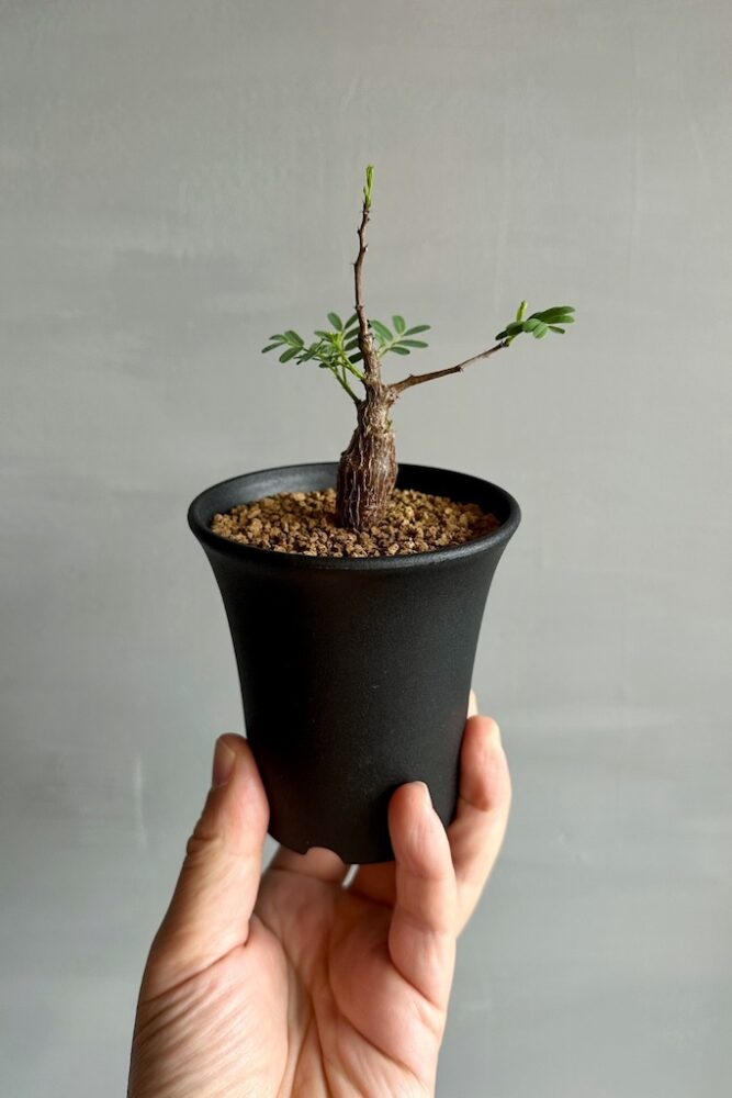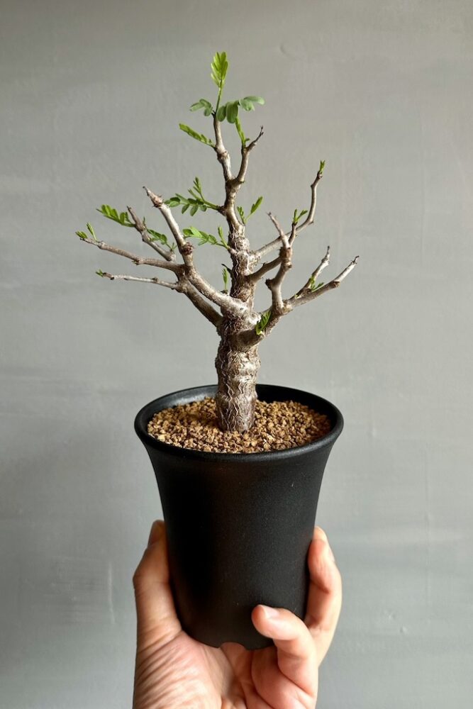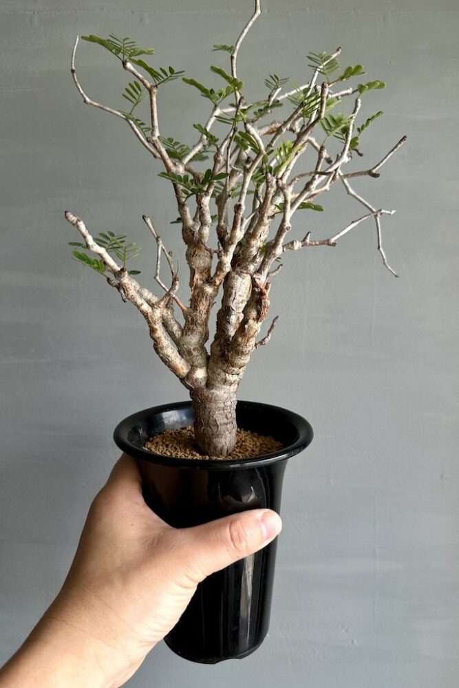 こちらの個体は、国内で種から育成された実生株です。まだ小さなサイズですが、すでに特徴的な羽状複葉の葉も確認できます。小さいうちは茶色の肌をしていますが、成長とともに灰白色の肌へと変化していきます。
