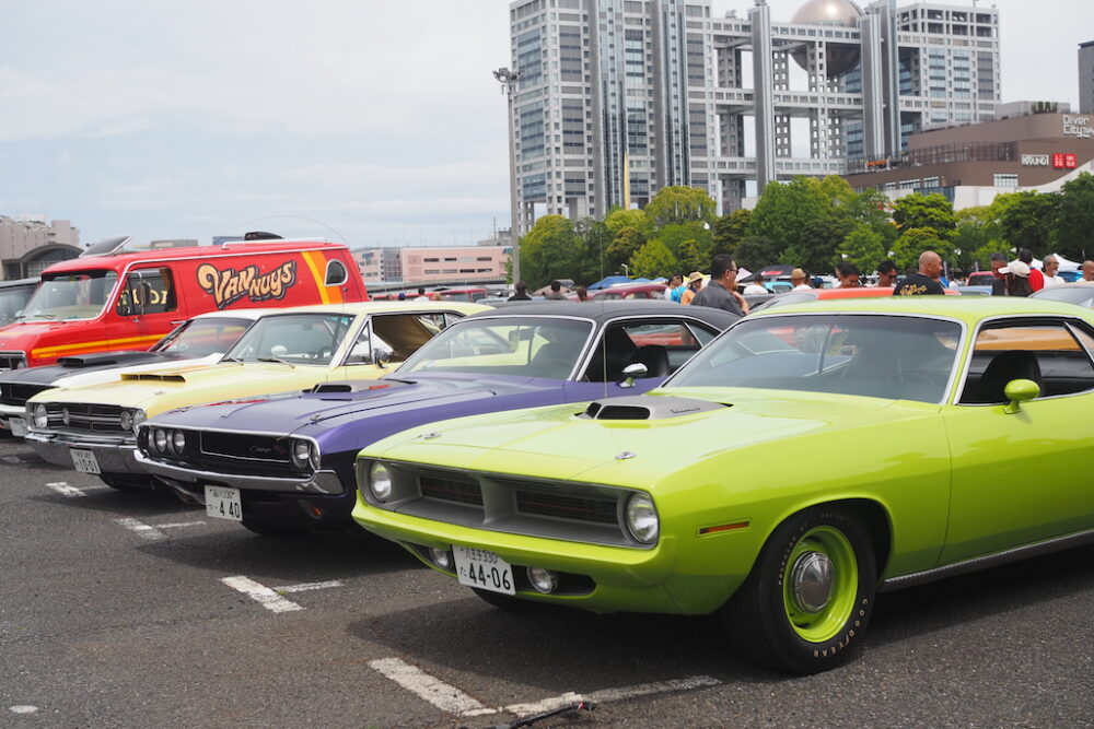 1970年代前後のマッスルカー全盛期、クライスラー系ブランドのダッジやプリムスは鮮烈なボディカラーのモデルを数多く生産した。派手なグリーンやパープルなど、これが純正色だった時代が存在したんだと勉強。