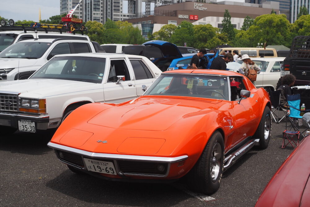 マッスルカー全盛期の1969年式シボレー・コルベットの第3世代。コークボトルラインと言われた流麗なボディラインに男らしいサイドマフラーという出で立ち。