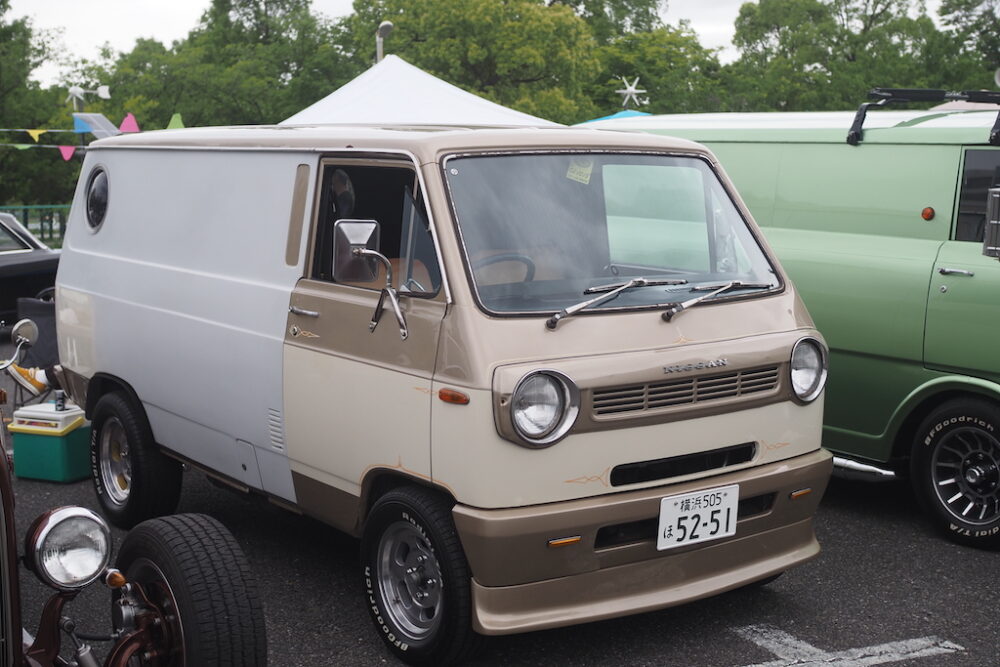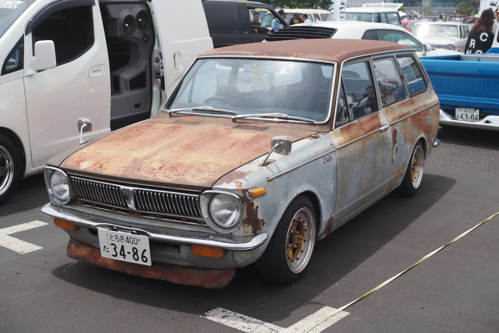 国産旧車も会場にちらほらと。スポーツカーというよりも、このトヨタ・カローラのバン(2ドアワゴン)のようなゆるーい雰囲気のモデルが多かった。あえて経年変化で色褪せた塗装のまま登場。