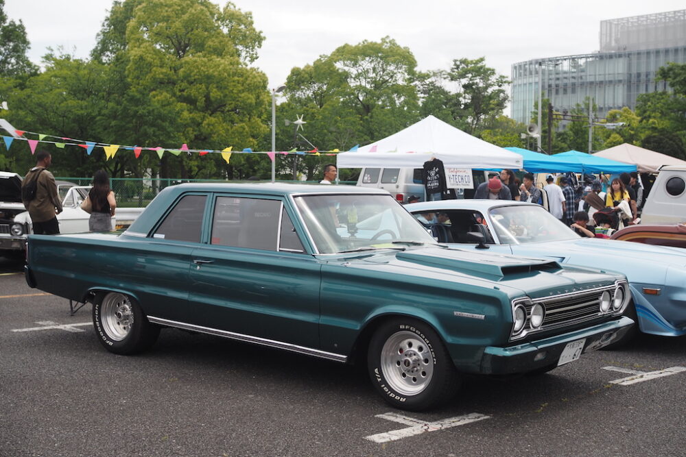 1967年式プリムス・ベルベデア。2ドアポストセダンという何の変哲もないボディに強力なエンジンを積んでいることは盛り上がったエンジンフードで想像ができる。ホイールは社外品でお化粧済み。