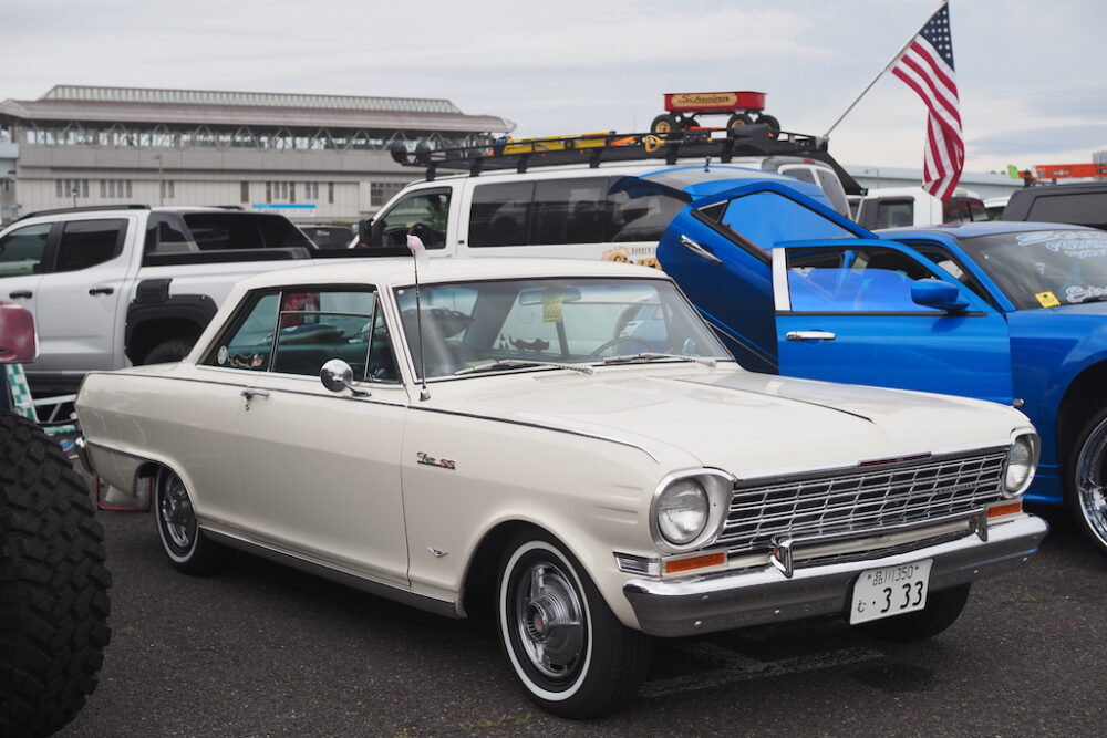 シボレーのコンパクトカーとして登場したノバの1963年式。派手なカスタムをしないで、ホワイトリボンのタイヤにホイールキャップという当時そのままのスタイルが好感。当時は2ドアクーペからワゴンまで存在して1970年代まで生産された。