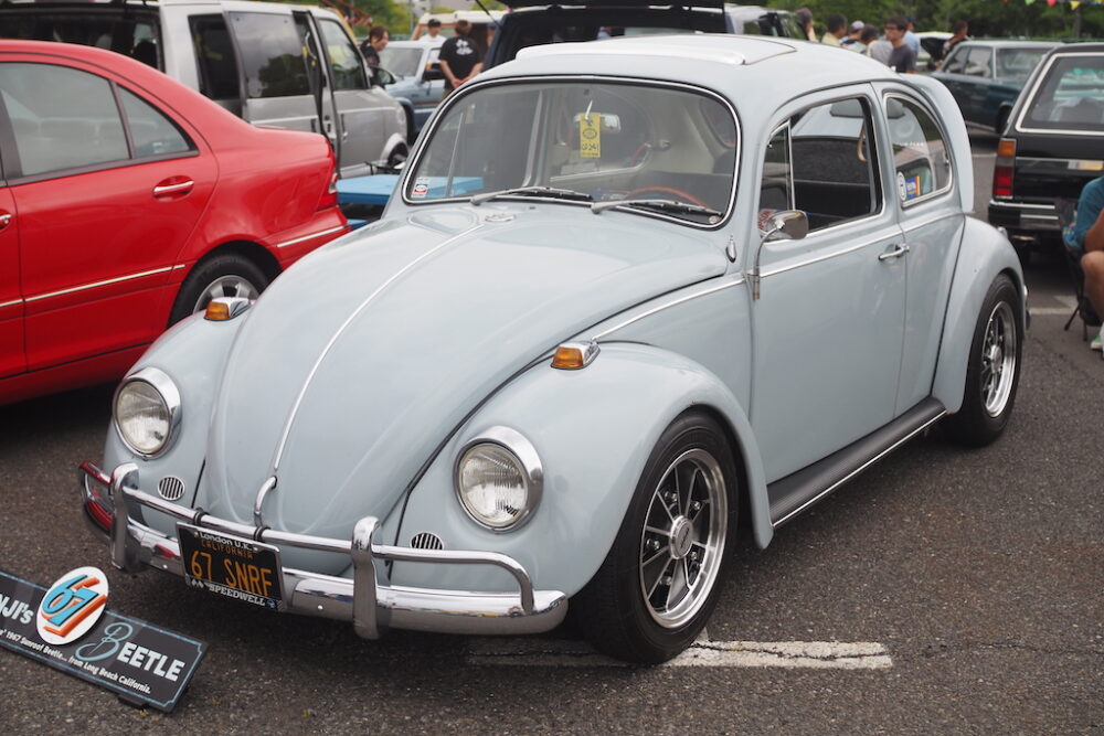 1967年式VWタイプ1(ビートル)。ダブルバンパーにアルミホイールで仕上げたシャキっとした出で立ち。オールドビートルも年々高騰物件。このまま大事に乗っていただきたい。