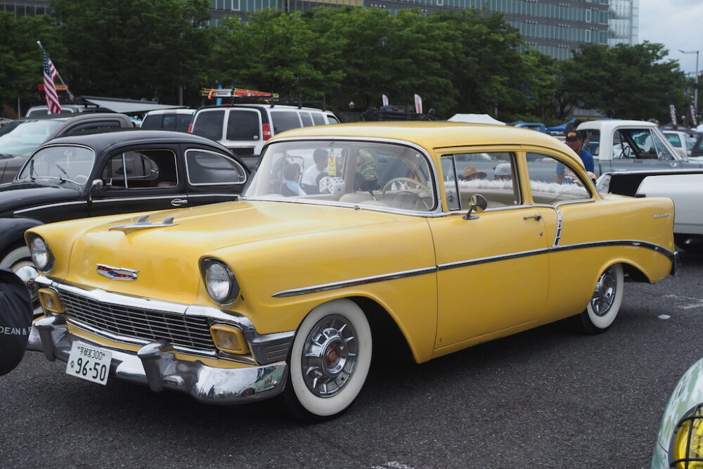 アメリカンフィフティーズの代表的なモデルであるシボレー・ベルエアの1956年式。こういうモデルは派手なボディカラーが自然と似合ってしまう。ホイールキャップはキャデラックに換装済み。