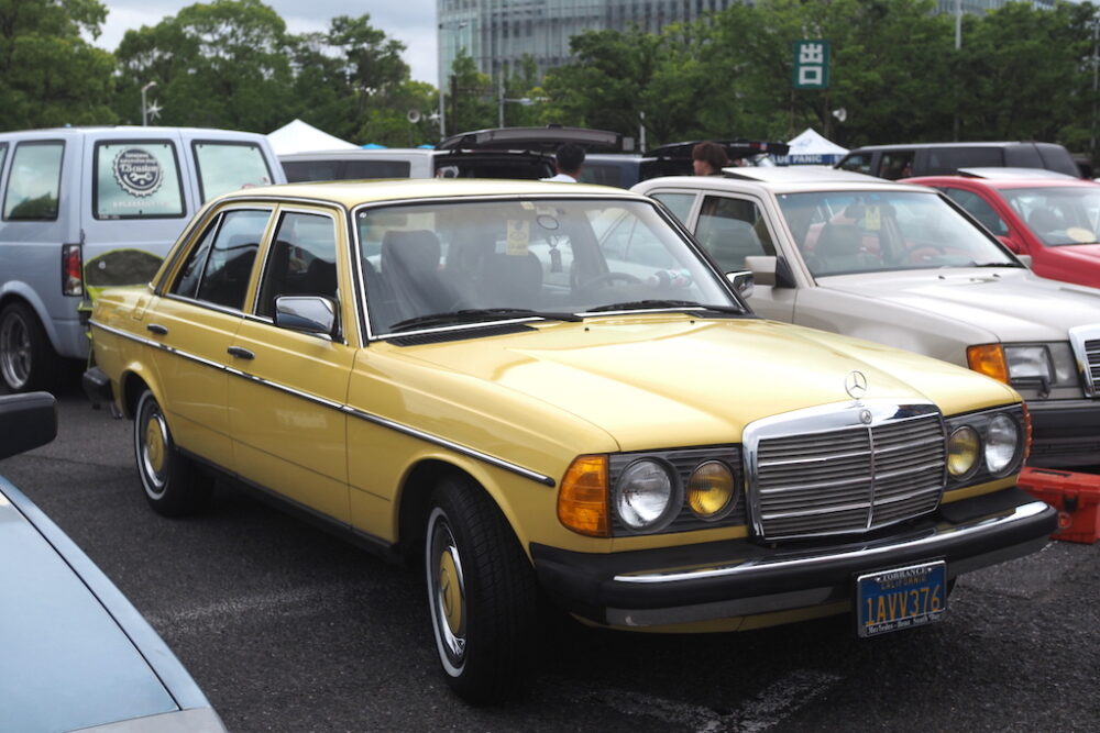 アメリカ仕様の4灯化されたヘッドライトが特徴のメルセデスベンツ。W123と形式で呼ばれる当時のミディアムクラスだ。ドイツ車をアメリカっぽく乗るのもひとつのスタイルだと再確認。