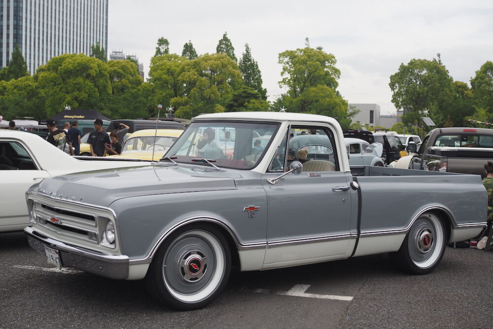新車みたいにレストアされた1967年式シボレーC-10ピックアップ。クラシカルな2トーンペイントながら大径ホイールを履いて足元はモダンに。その走りも見てみたくなる仕上がり。