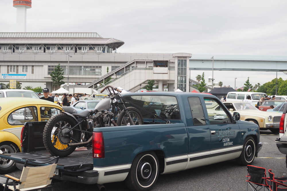 見せるためというより、バイクを積載しやすくするためのローダウンだろうか。低く身構えたシボレーC-1500ピックアップ。ベッドにはショベルヘッドのカスタムハーレーを積んで実用車であることをアピール。