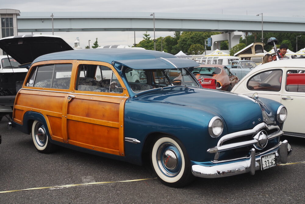 ボディサイドがリアルウッドになっているウッディワゴンは当時のコーチビルダーによって製造された稀少車。これはきっちりとレストアされた1949年式フォードのウッディ。アメリカではウッディワゴンだけが集まるイベントも存在するほど多くの愛好家がいるモデル。