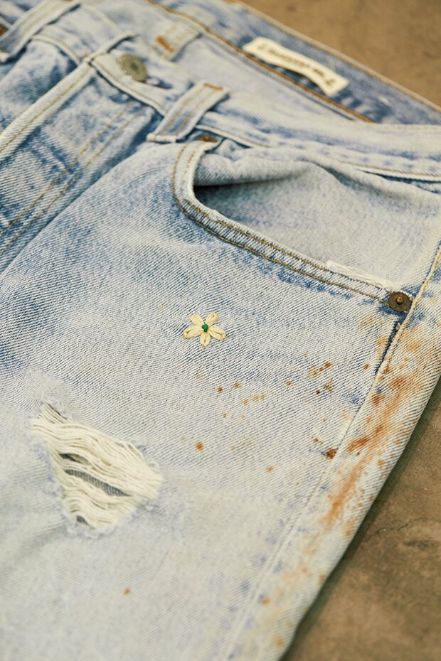 夏に向けてのの時期にピッタリなアイスブルーカラー、さりげない花の刺しゅう、膝部分は大胆にダメージが入り、イイ具合に汚い。うん、超ツボなの。このジーンズならジャージを合わせても、ブラウスを合わせてもバランスよくコーディネイトできる。両極端の組み合わせ、好きなんだよな。