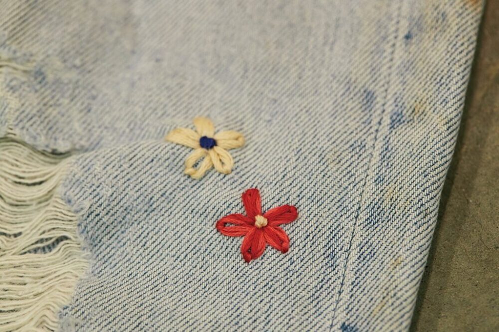 我々のブースの隣をチラッと覗いてみると、なんとも興味の沸く商品がズラッと並んでいた。ジーンズやTシャツ、ベースボールキャップに花の刺しゅうが施されているのだ。興味津々に多数置かれたジーンズを物色していると、「この子だ!」と、ビビッときてしまった。