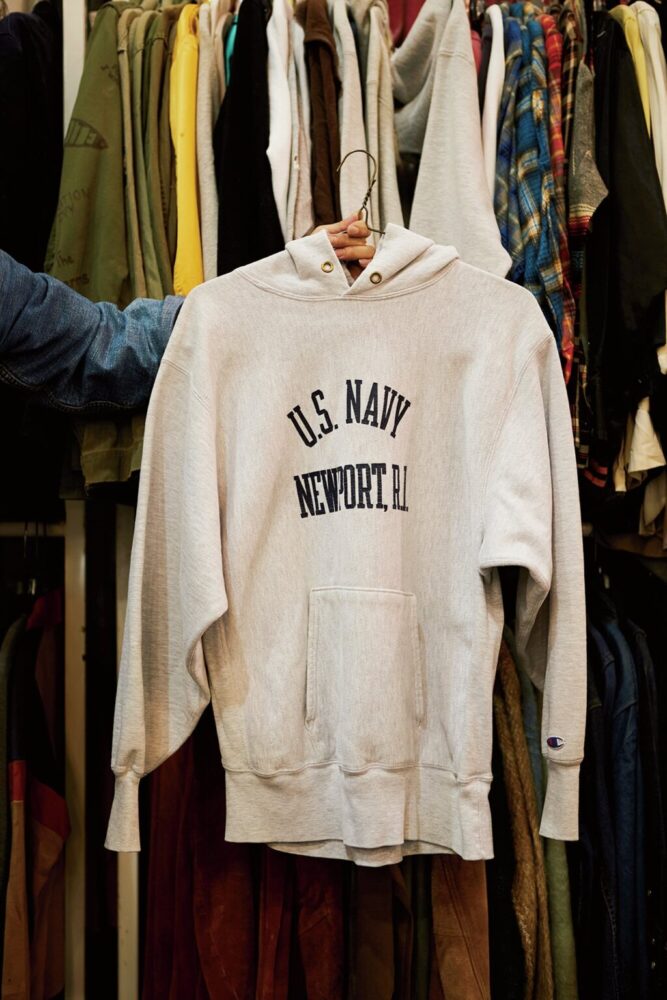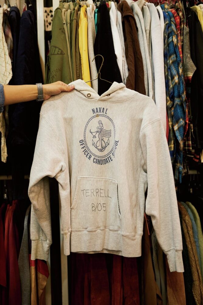 ’80年代製チャンピオンのフーディに施された、USNの士官候補生学校(Officer Candidate School)の染み込みプリントが秀逸。手書きのカスタムも素敵である。685ドル