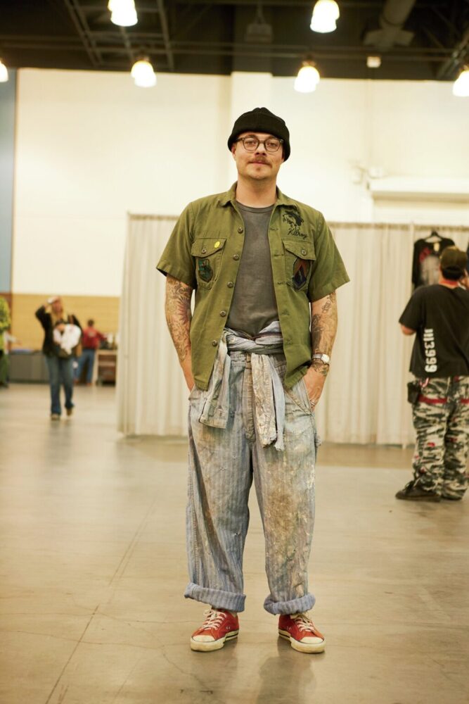袖カット&チェーン刺繍を施した、USAFの戦略航空軍団のパッチ付きユーティリティシャツを愛用するスミスさん。ダメージが激しいツナギの使い方がオシャレである