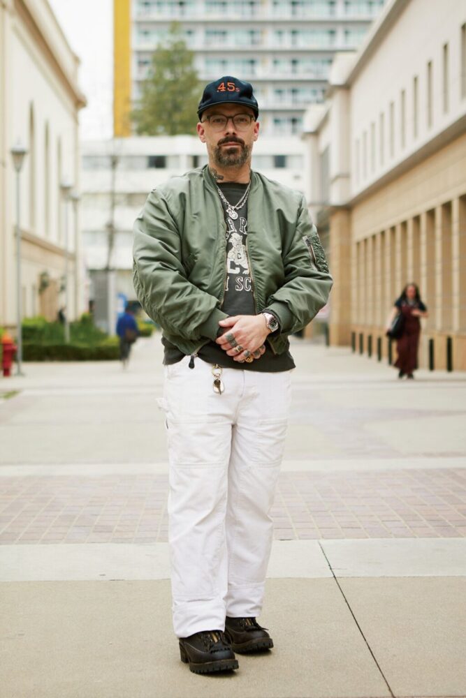 大人気のベイカーパンツにUSNのユーティリティジャケット、そして半袖スウェットと、ミリタリー好きらしいアイテムセレクトだ。胸元に描かれた“MANAGER”の意味が知りたい!