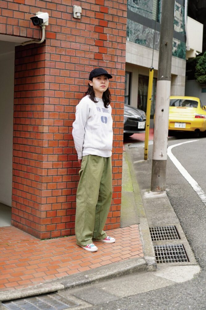 近年、人気が急上昇しているUSMCのHBTパンツを軸にコーディネイト。トップスにはチャンピオンのリバースウィーブのスウェットで王道感を出しつつ、サイズ感や足元でうまく遊びを演出している。