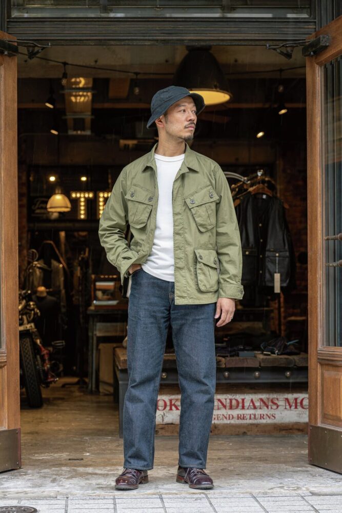 タウンユースだけでなく、バイク乗車時でも機能的なファティーグジャケットを羽織った力の抜けたミリタリーコーデ。パンツのフォルムや靴のチョイスでさりげなくクリーンなテイストに。