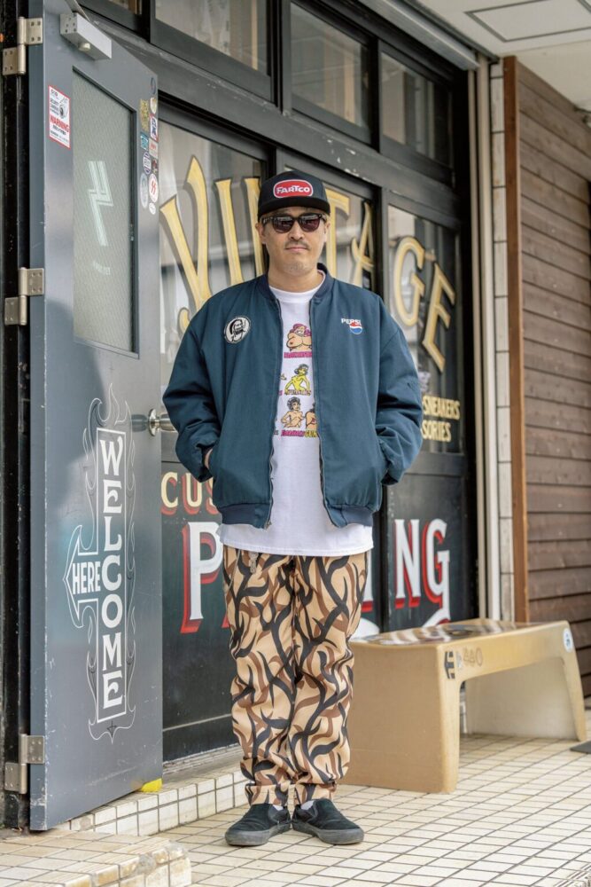 アースカラーのトライバルカモパンツにオーバーサイズのワークジャケットを合わせた’90sストリートの香りが漂う着こなし。大人の遊び心が溢れるインナーにも注目。