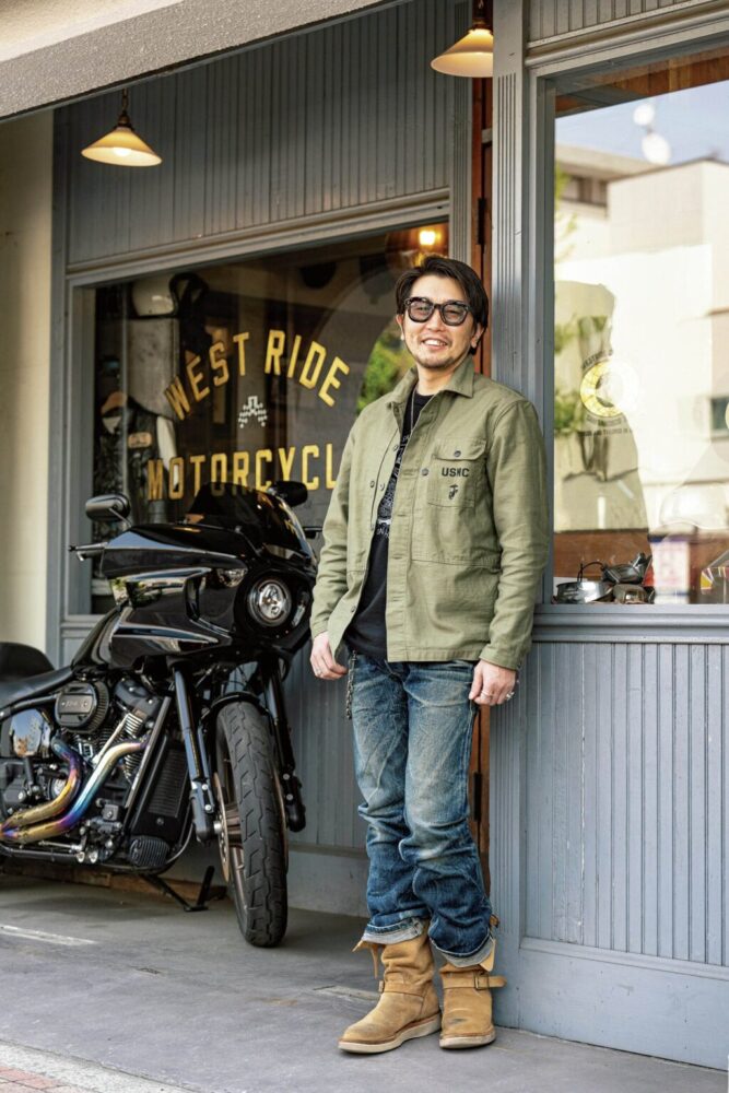 USMC M-44モチーフのWESTRIDE のジャケットを主役としたバイク乗りのスタイルを提案。王道のアイテム、配色でまとめ無骨さを打ち出したシンプルな着こなしだ。