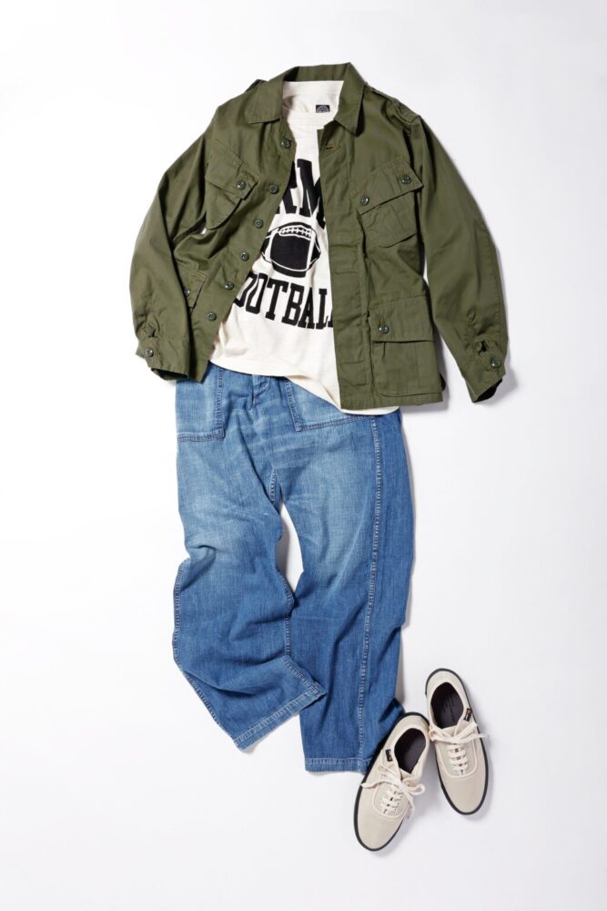 ミリタリーウエアの代名詞であるファティーグジャケットをベースにしたシャツをメインにコーディネイト。ホワイトや生成りをベースにしたTシャツに穿き込んで色落ちしたデニムを合わせることで、軽やかで春らしい印象に。