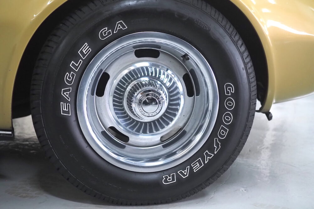 純正のラリーホイールにホワイトレターのグッドイヤーのタイヤがいかにもアメリカらしい。タイヤサイズは前後とも225/70-15がセットされる。